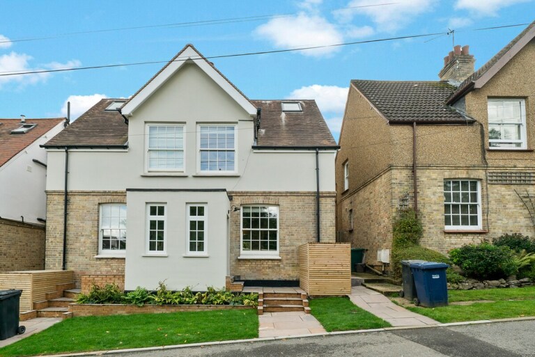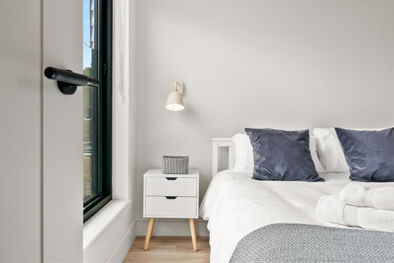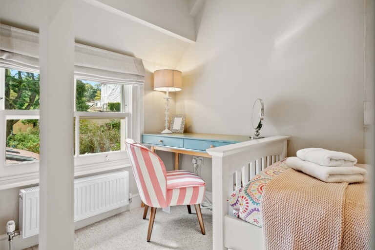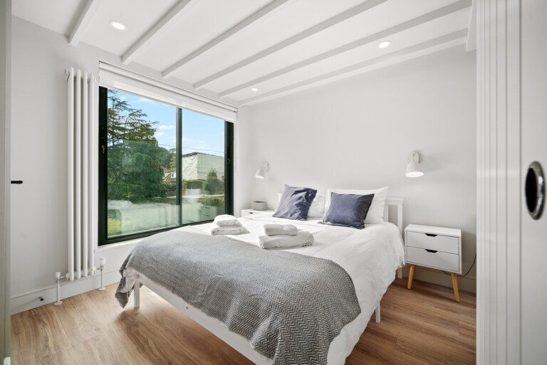 Upstairs, the family bathroom offers both a bath and rain shower. The first-floor master bedroom has a king-size bed, while a smaller room with bunk beds, a desk, and storage is perfect for children. On the second floor, another king-size master bedroom with en suite shower room and dressing area boasts stunning views over the garden and woods through sliding doors, complemented by velux windows to allow through breeze.