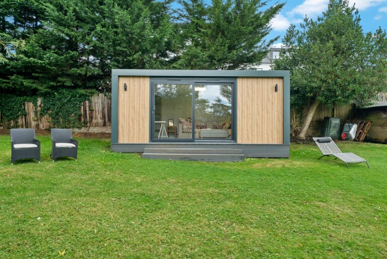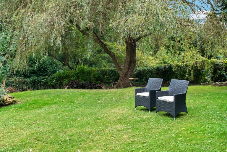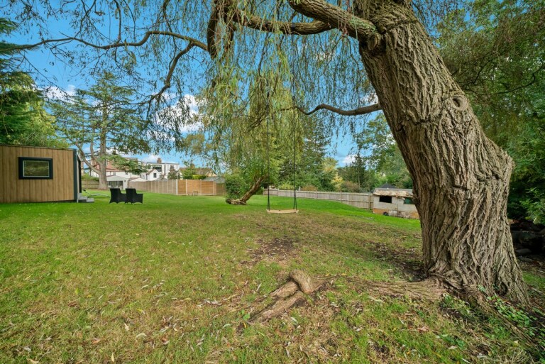Sliding doors open wide to bring in fresh air, while remote-controlled Velux windows flood the space with natural light. The fully fenced garden is ideal for children and well-behaved dogs, with a swing hanging from a willow tree and stepping stones leading past a majestic cedar tree to the garden office. The office includes a desk, large sofa, and another smart TV, offering a peaceful workspace or retreat. The garden extends down to woodland views, creating a tranquil setting.