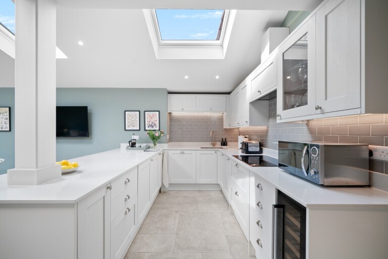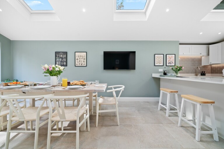 At the front of the house, a cosy sitting room with a corner sofa and armchair offers an ideal space to relax in the evening, with a 65-inch smart TV for entertainment. The open-plan kitchen and dining area is fully equipped with modern appliances, including two electric ovens, microwave, dishwasher, wine fridge, large fridge and freezer, plus ample crockery and cutlery. Guests can unwind on the large sofa or gather around the dining table seating eight. Step outside to the garden terrace, featuring an outdoor dining table perfect for al fresco meals.